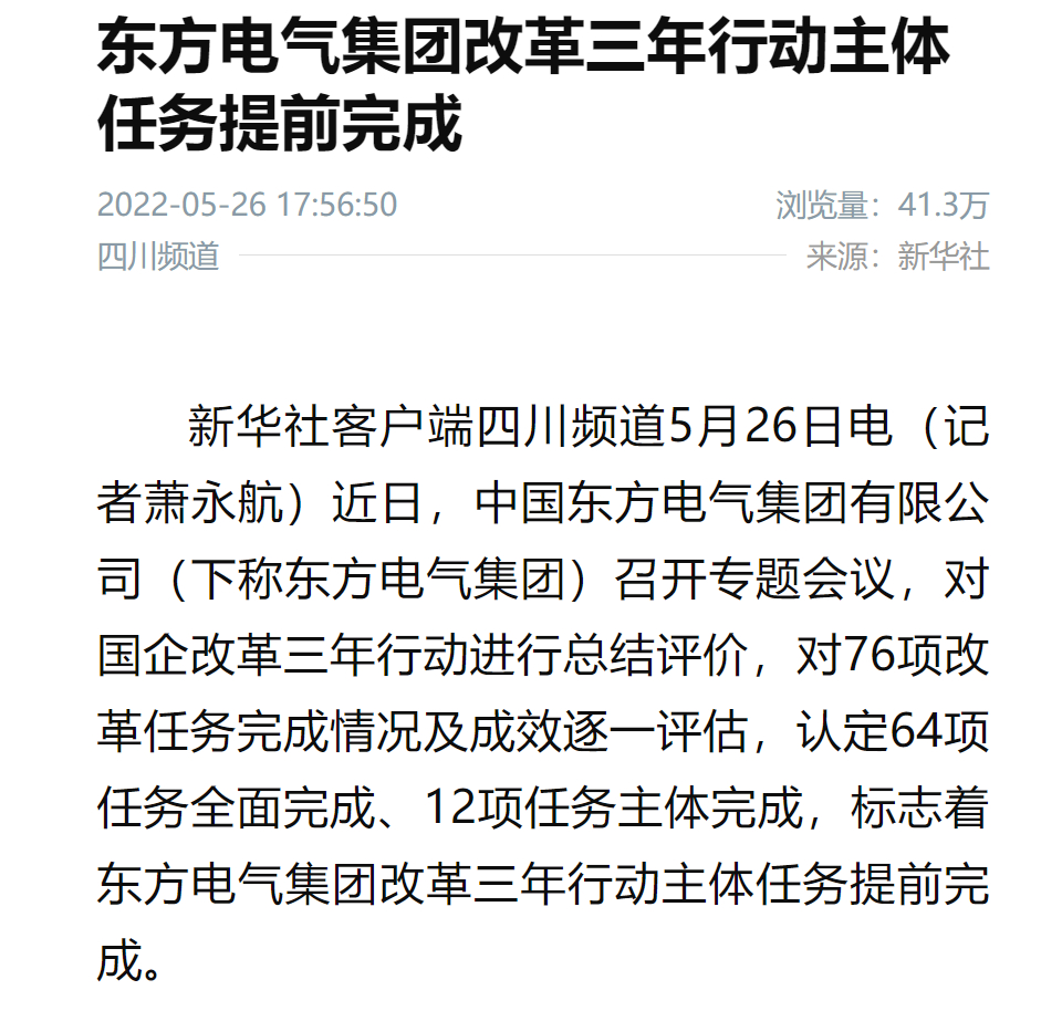 新华社客户端四川频道5月26日电(记者萧永航)近日,中国z6尊龙·凯时(中国区)官方网站电气集团有限公司(下称z6尊龙·凯时(中国区)官方网站电气集团)召开专题会议,对国企改革三年行动进行总结评价,对76项改革任务完成情况及成效逐一评估,认定64项任务全面完成、12项任务主体完成,标志着z6尊龙·凯时(中国区)官方网站电气集团改革三年行动主体任务提前完成。