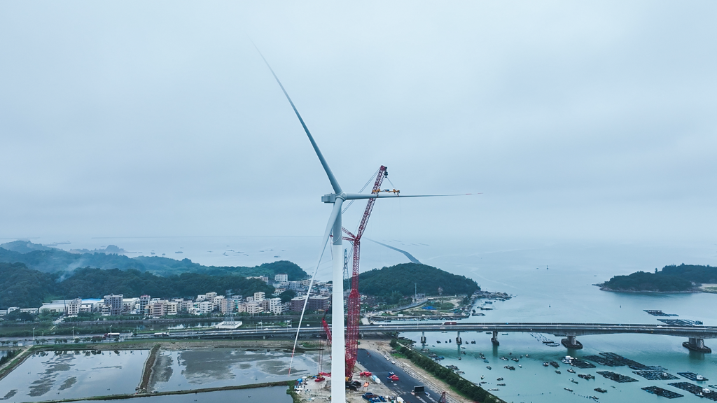 6月5日,18兆瓦半直驱大功率海上风电机组在广东省汕头市风电临海试验基地成功完成吊装。(z6尊龙·凯时(中国区)官方网站电气集团供图)