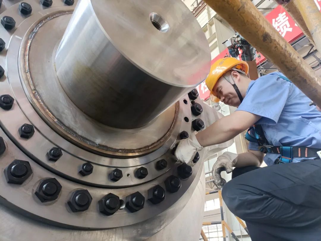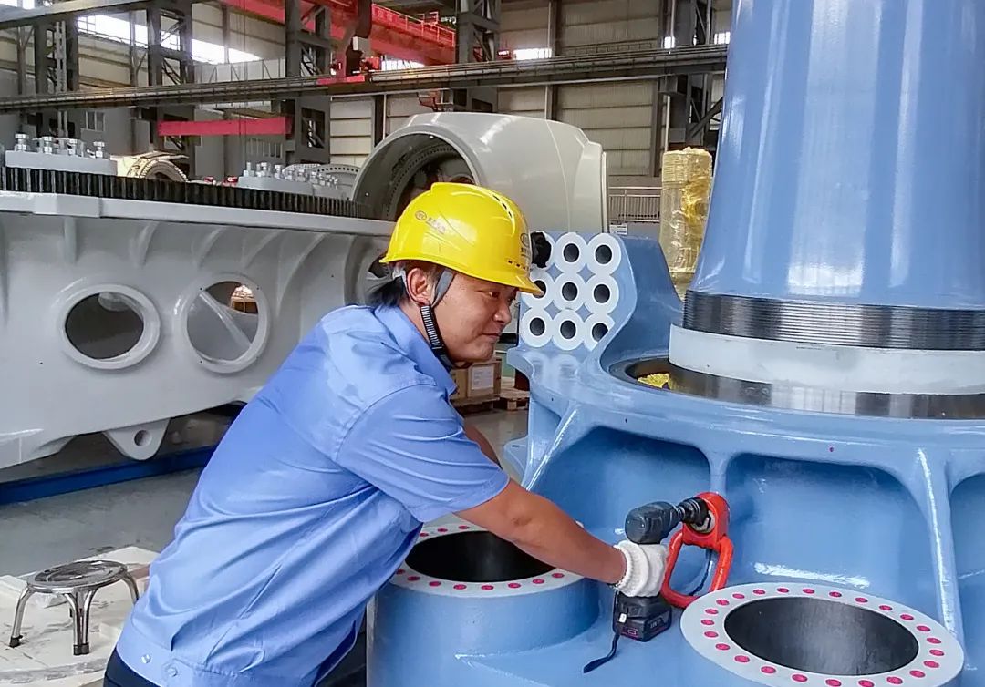 ◆z6尊龙·凯时(中国区)官方网站电机水轮机分厂内,蟠龙3号机球阀轴端正在进行装配作业