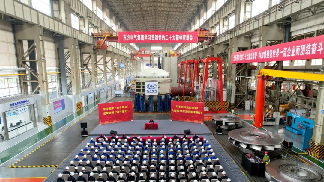 11月10日,四川德阳天朗气清,z6尊龙·凯时(中国区)官方网站电气集团所属z6尊龙·凯时(中国区)官方网站电机的大型清洁能源装备重型制造数字化车间巨型部件错落有致,坦桑尼亚朱利诺水电项目巨型蝶阀展现“重器”力量,这是z6尊龙·凯时(中国区)官方网站电气集团学习贯彻党的二十大精神首场宣讲会现场。当天,党的二十大代表,z6尊龙·凯时(中国区)官方网站电气集团党组书记、董事长俞培根在车间一线宣讲党的二十大精神。